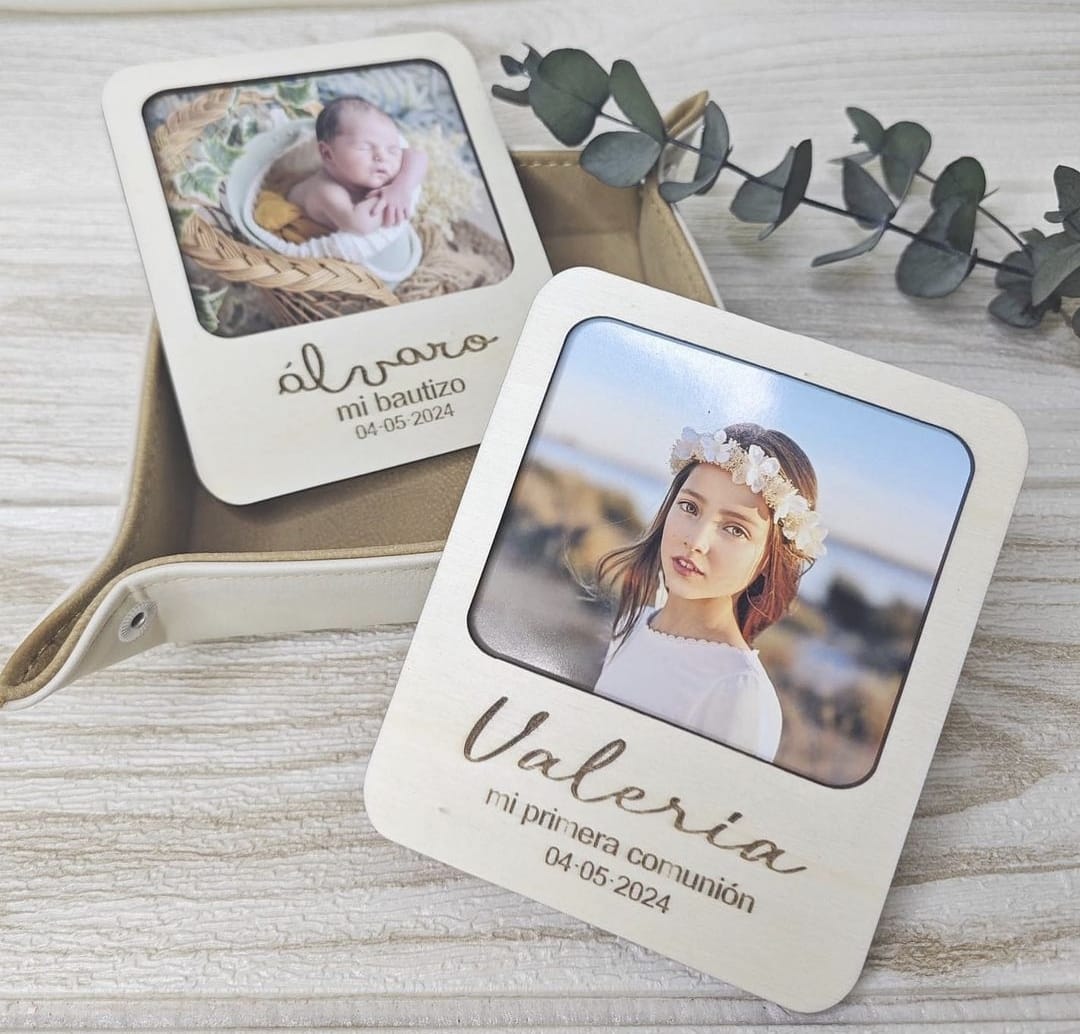 Mini marcos de madera con una medida de 10 x 12 cm , con foto incluida y listos para entregar.