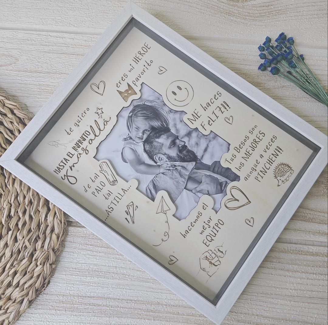 Cuadro de madera y cristal de un tamaño de 26,5×21,5 cm , teniendo en su interior lamina de madera con bonitos mensajes para papá y fotografía.